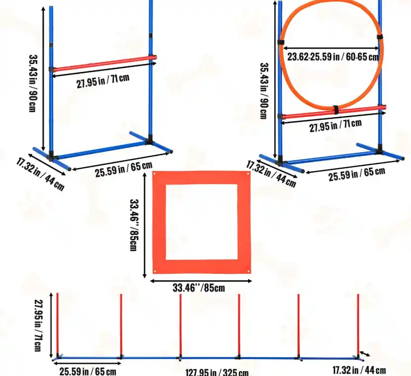 • Reguliuojamas aukštis: kliūties ir lanko padėtį galima pritaikyti pagal šuns dydį, amžių ir treniruočių lygį.