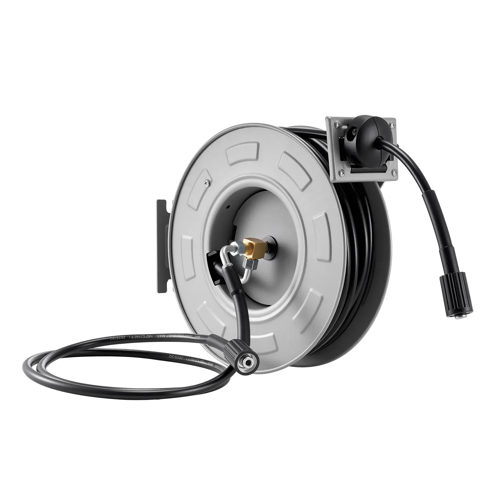 Ši žarnos ritė pagaminta iš tvirto Q235A plieno, turi automatinio susukimo mechanizmą, 360° pasukamą žalvarinį įvadą ir gali būti montuojama prie sienos, lubų arba grindų. Komplekte esanti 19,8 m ilgio 1/4 colio žarna leidžia patogiai pasiekti reikiamą valymo zoną, o papildoma 1,5 m įvadinė žarna padeda lengviau prijungti sistemą prie aukšto slėgio plovimo įrenginio. Dėl kompaktiškos konstrukcijos ir lankstaus montavimo ši ritė puikiai tinka automobilių, grindų, kiemo dangų ir kitų paviršių valymui.