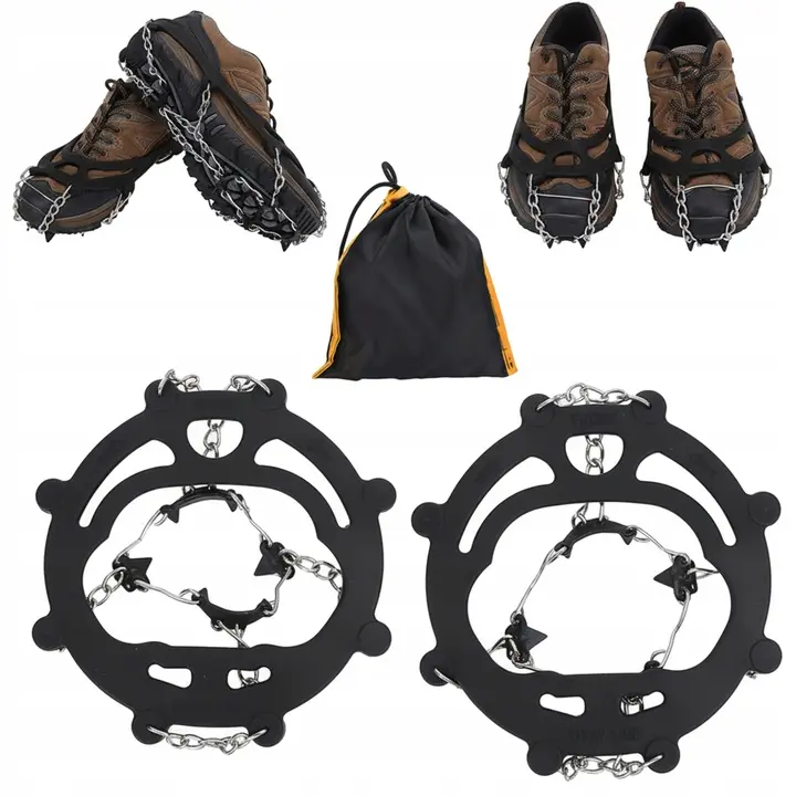 - 20 grūdinto plieno smaigų (10 kiekvienai kojai) ir metalinė grandinė patikimam sukibimui