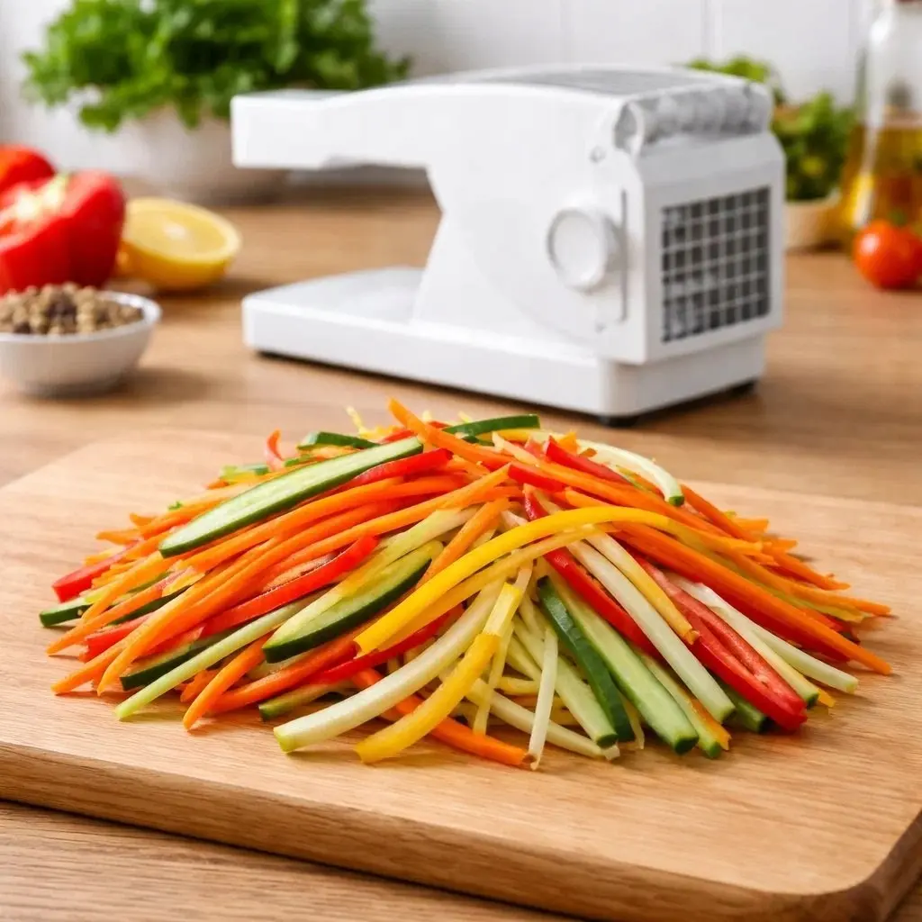 • Greitas pjaustymas: vienu paspaudimu galima paruošti vienodo dydžio bulvytes ar daržovių lazdeles be ilgo darbo peiliu.