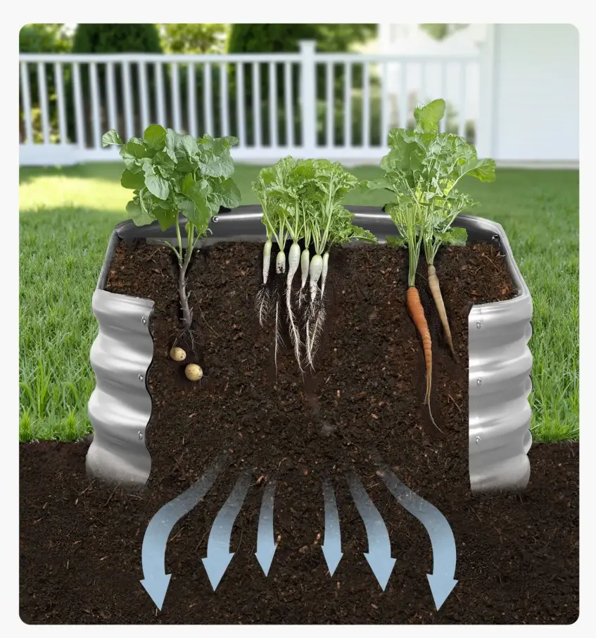 - Pakelta konstrukcija: aiškiai atskirta auginimo zona padeda palaikyti daugiau tvarkos sode ir lengviau organizuoti augalų išdėstymą.