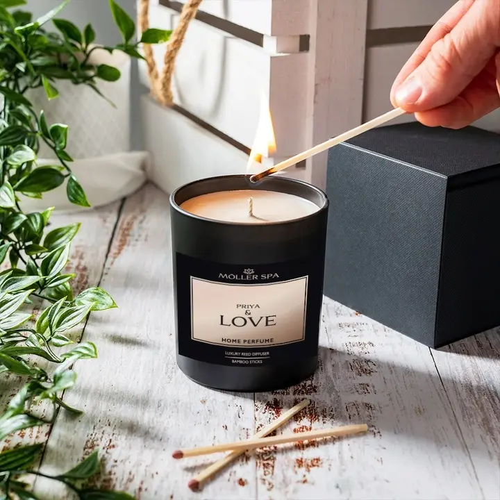 - Sojų vaško žvakė, kuri padeda sukurti ramią atmosferą