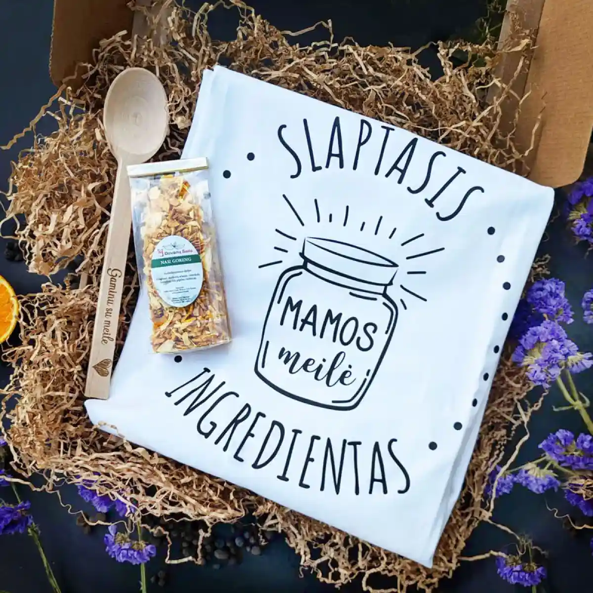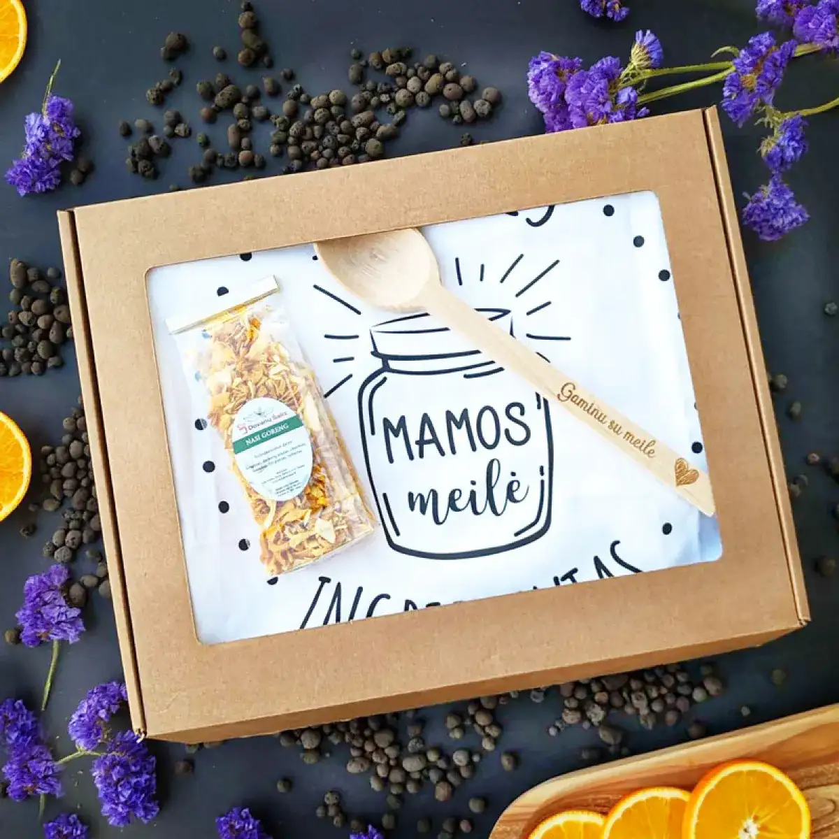 Rinkinyje suderinti daiktai, kurie puikiai tinka mamai, mėgstančiai gaminti ir rūpintis artimaisiais. Medvilninė prijuostė pravers kasdien ruošiant maistą, medinis šaukštas papildys virtuvės reikmenis, o prieskonių mišinys suteiks daugiau skonio įvairiems patiekalams. Šis rinkinys sukuria jaukų, dėmesingą ir praktišką dovanos įspūdį.