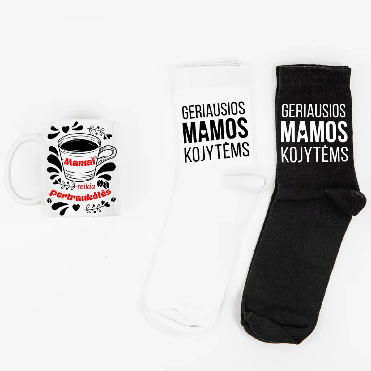 Rinkinyje yra: puodelis „Mamai reikia pertraukėlės“ – 1 vnt., moteriškos kojinės „Geriausios mamos kojytėms“ – 2 poros.
