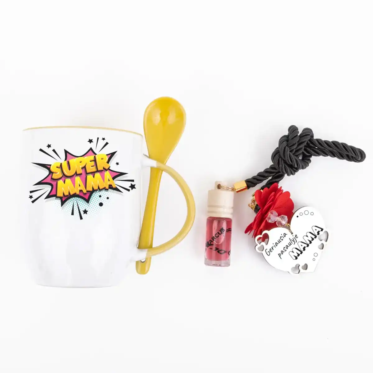 Rinkinyje yra: puodelis su šaukšteliu „Super mama“ – 1 vnt., automobilio kvapukas „Geriausia pasaulyje MAMA“ – 1 vnt.