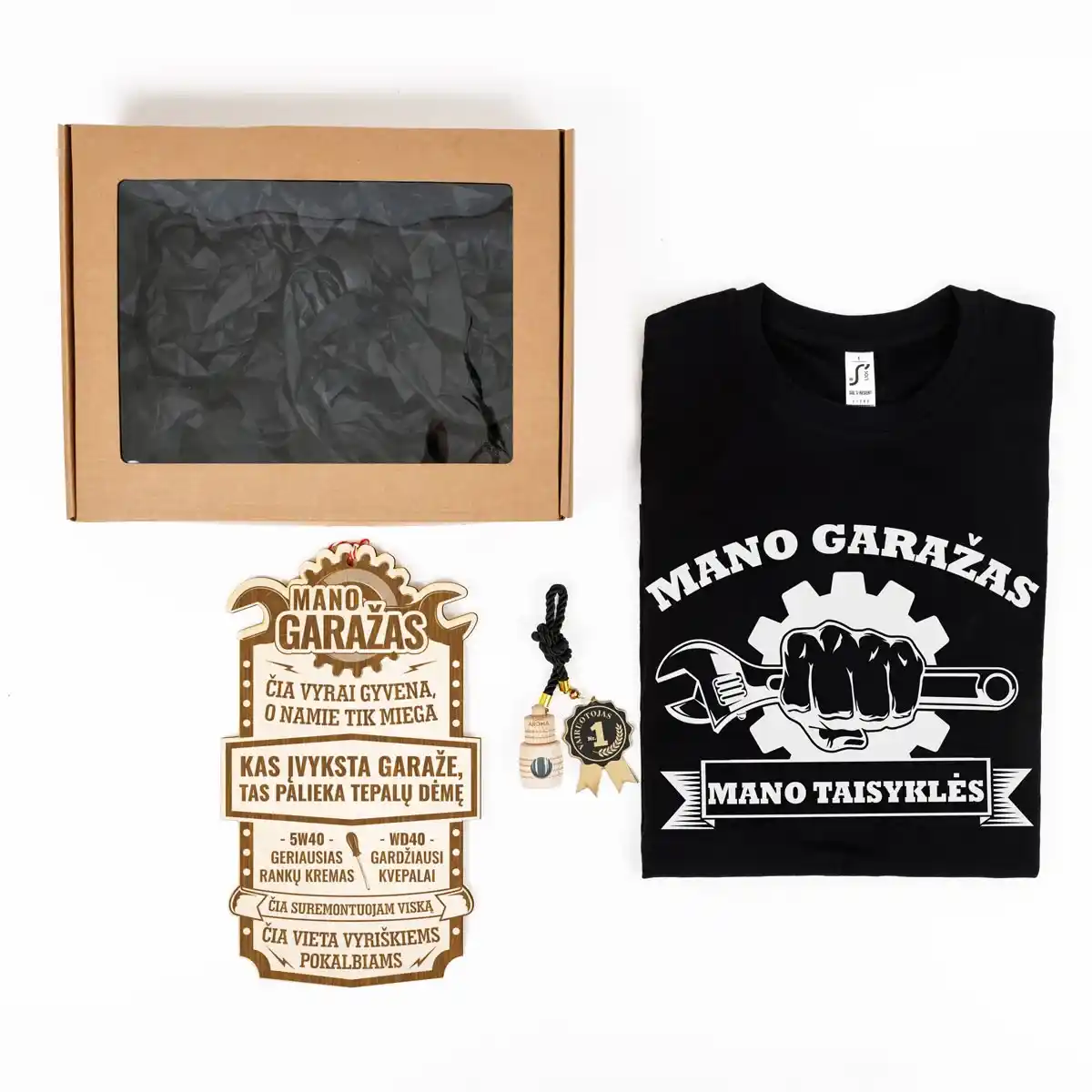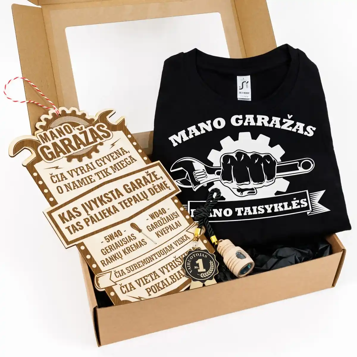 Rinkinyje esantys marškinėliai, graviruota medinė lentelė ir automobilio kvapukas sukuria vientisą garažo atmosferą. Tai dovana, kuri nebus pamiršta – ji bus naudojama, rodoma ir kels šypseną kiekvieną kartą užsukus į garažą.