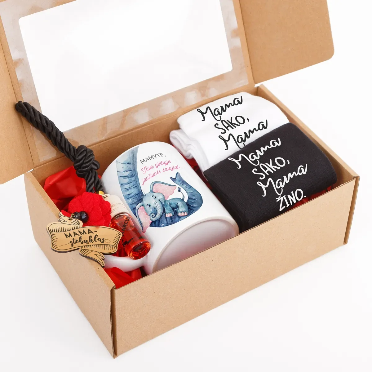 Rinkinyje yra: puodelis „Mamytės glėbyje“ – 1 vnt., automobilio kvapukas „MAMA – stebuklas“ – 1 vnt., moteriškos kojinės „Mama sako, mama žino“ – 2 vnt.