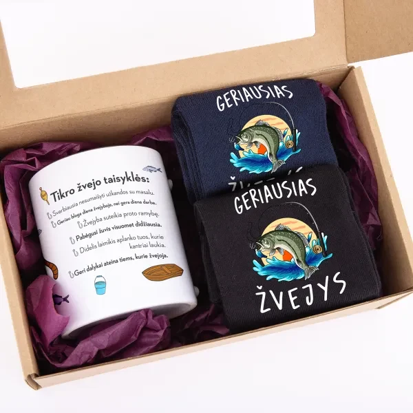 Rinkinyje suderinti kasdien naudojami daiktai su žvejo tematika. Puodelis su užrašu ir dvi poros teminių kojinių sukuria vientisą, aiškų rinkinį, kuris tinka dovanoti kolegai, draugui, vyrui ar broliui. Dėžutė leidžia dovaną įteikti iš karto – be papildomų rūpesčių.