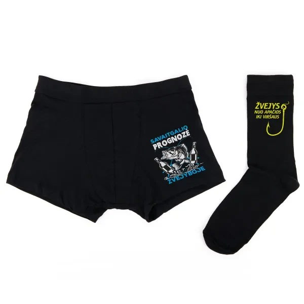 Rinkinį sudaro teminiai vyriški apatiniai ir kojinės su žvejybos motyvais. Tai praktiški daiktai, kurie kasdien primins apie mėgstamą veiklą ir sukels šypseną. Viskas supakuota tvarkingoje dovanų dėžutėje, todėl rinkinys tinka iškart dovanoti.