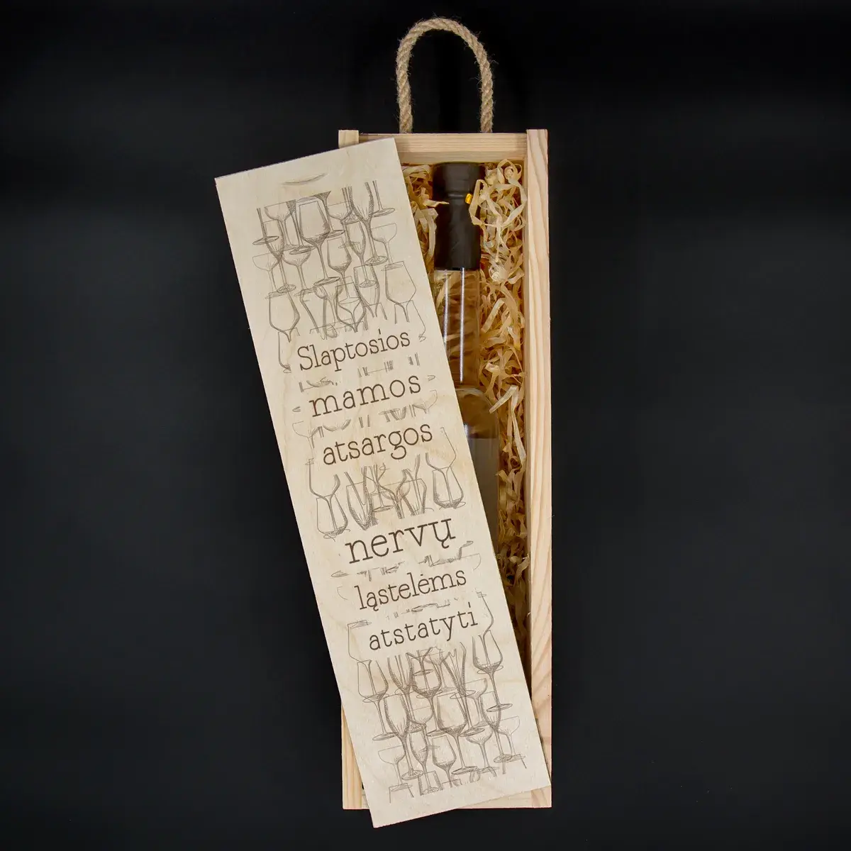 Medinė dėžė buteliui mamai „Slaptosios mamos atsargos“ – šmaikšti ir originali dovanos idėja ypatingai progai
