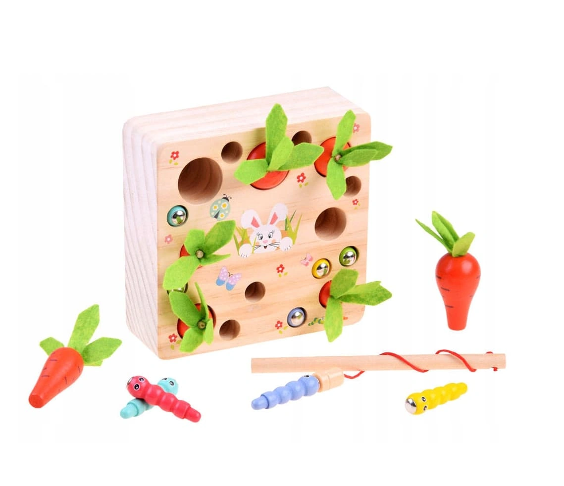 Medinis žaidimas „Kirminukai ir morkos“ 2in1 leidžia vaikui traukti morkas iš „žemės“ ir gaudyti kirminus magnetine meškere. Skirtingi veiksmai įtraukia ir skatina aktyvų žaidimą, todėl vaikas noriai prie jo sugrįžta. Paprasta žaidimo idėja greitai suprantama, todėl vaikas gali žaisti savarankiškai.
