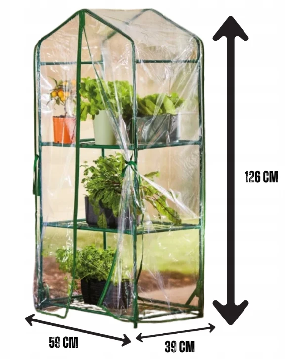 Tvirta metalinė konstrukcija ir trys lentynos leidžia patogiai išdėstyti augalus keliuose aukštuose. Uždangalas su užtrauktuku saugo nuo lietaus, dulkių ir vėjo, o prireikus lengvai atidaromas vėdinimui ar laistymui. Šiltnamis tinka daigų auginimui, žolelių laikymui ar dekoratyvinių augalų apsaugai pereinamuoju sezonu.