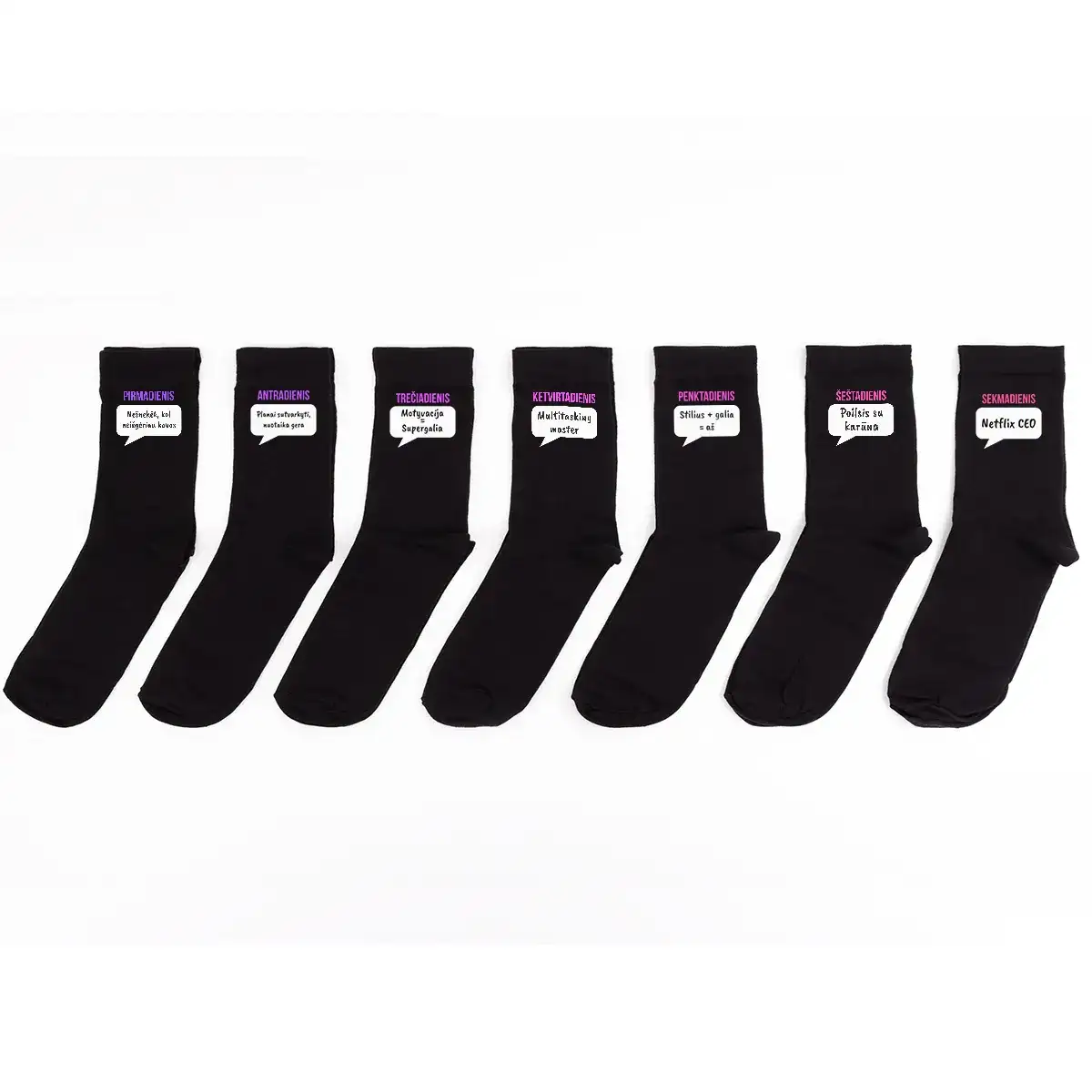 Moteriškų kojinių rinkinys Bosės savaitės planas – tai 7 poros kojinių su skirtingais užrašais ir dizainais, skirtais kiekvienai savaitės dienai. Puikus pasirinkimas moteriai, kuri mėgsta stilių su charakteriu.