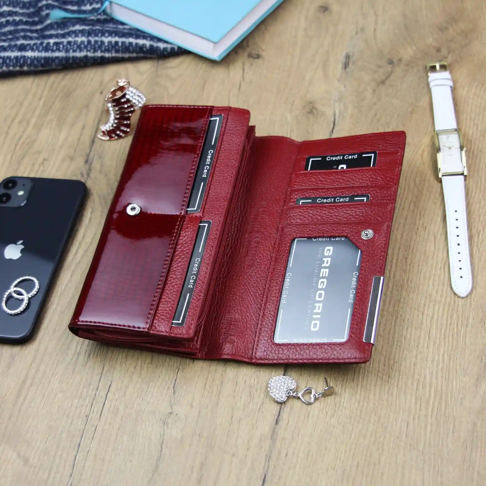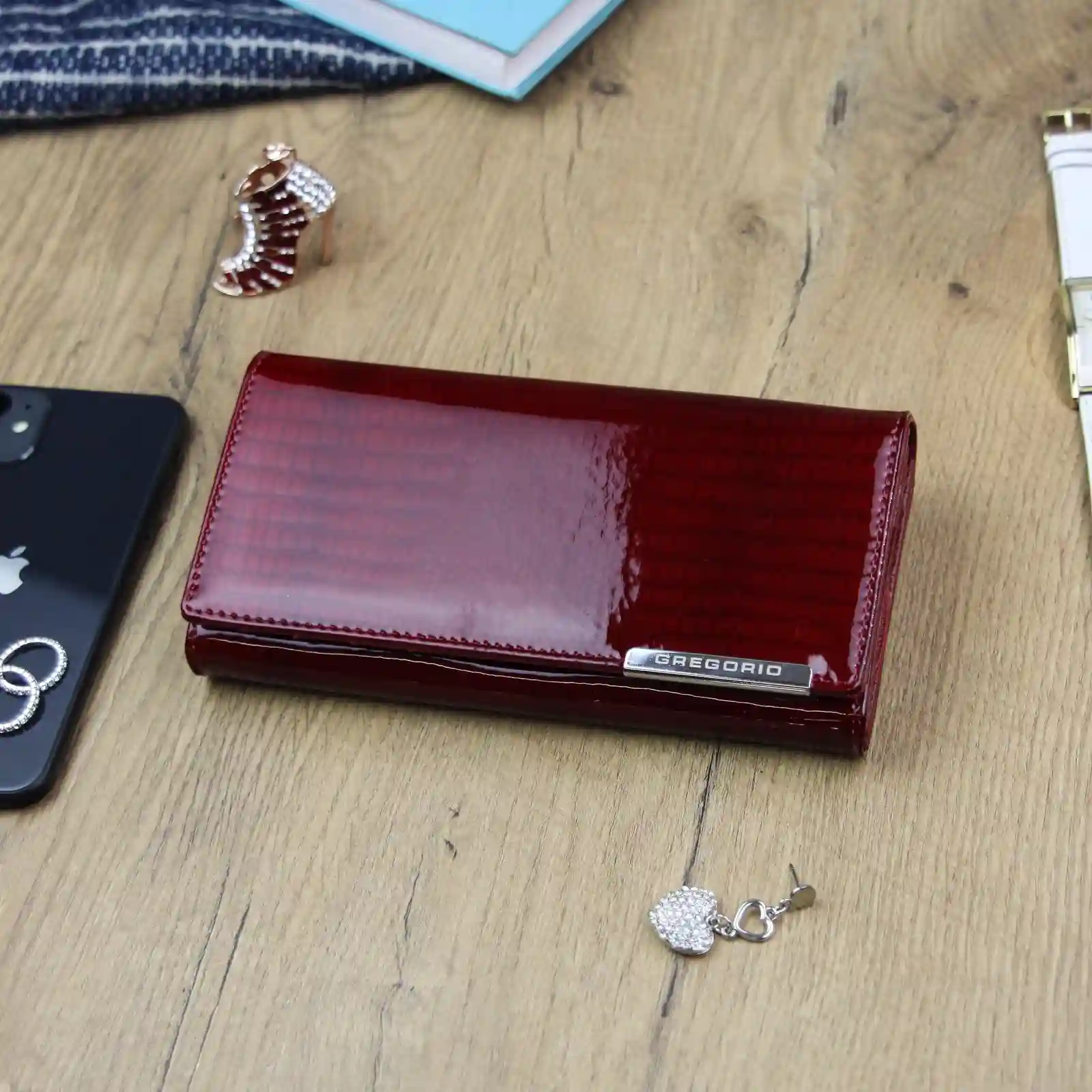 Raudona natūralios odos didelė moteriška piniginė Gregorio – tai išskirtinis ir elegantiškas aksesuaras moteriai, vertinančiai prabangą, talpumą ir kokybiškas medžiagas. Piniginė pagaminta iš aukščiausios kokybės natūralios itališkos lakuotos odos, dekoruotos krokodilo odos rašto įspaudu.