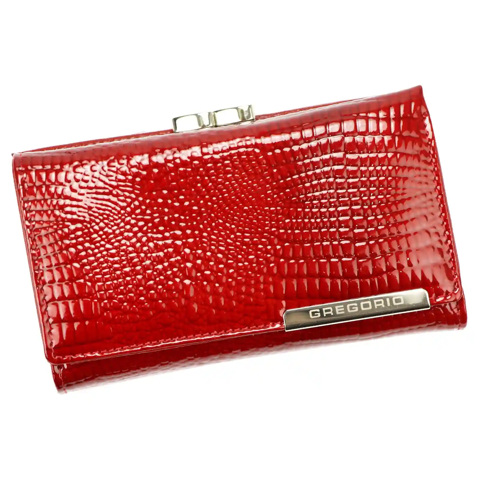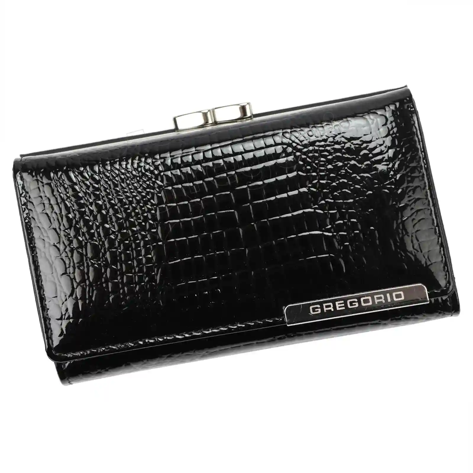 Natūralios odos moteriška piniginė Gregorio – tai elegantiškas ir praktiškas pasirinkimas moteriai, ieškančiai kokybės, patogaus dydžio ir išskirtinio dizaino. Piniginė pagaminta iš aukštos kokybės natūralios itališkos lakuotos odos, dekoruotos krokodilo odos rašto įspaudu.