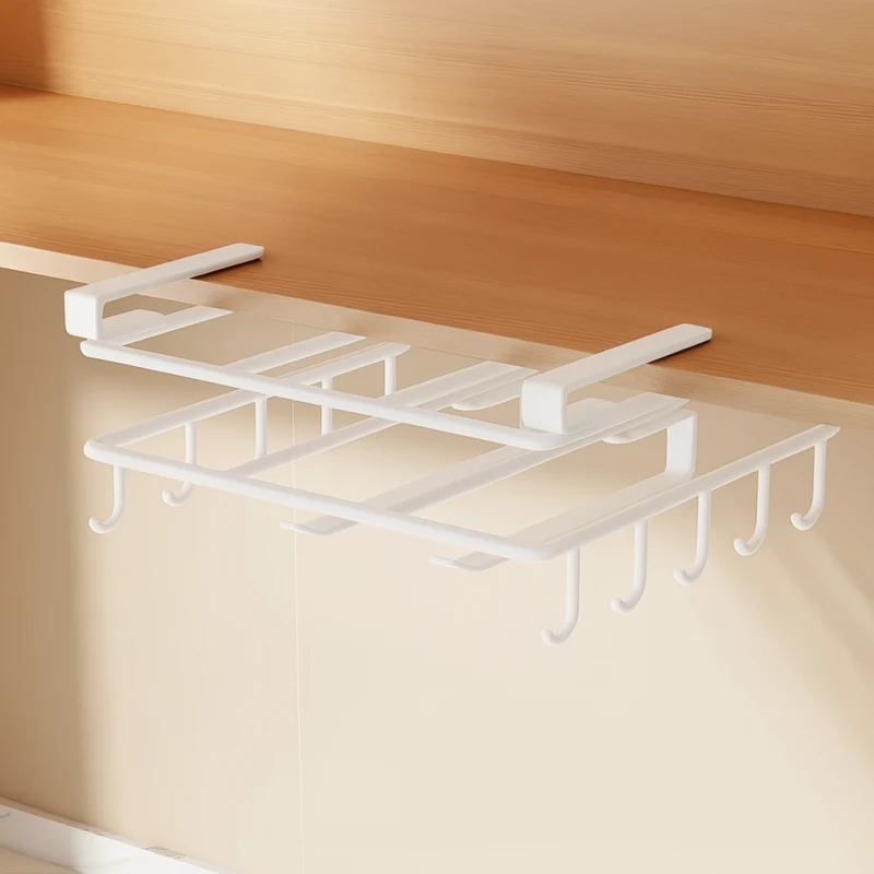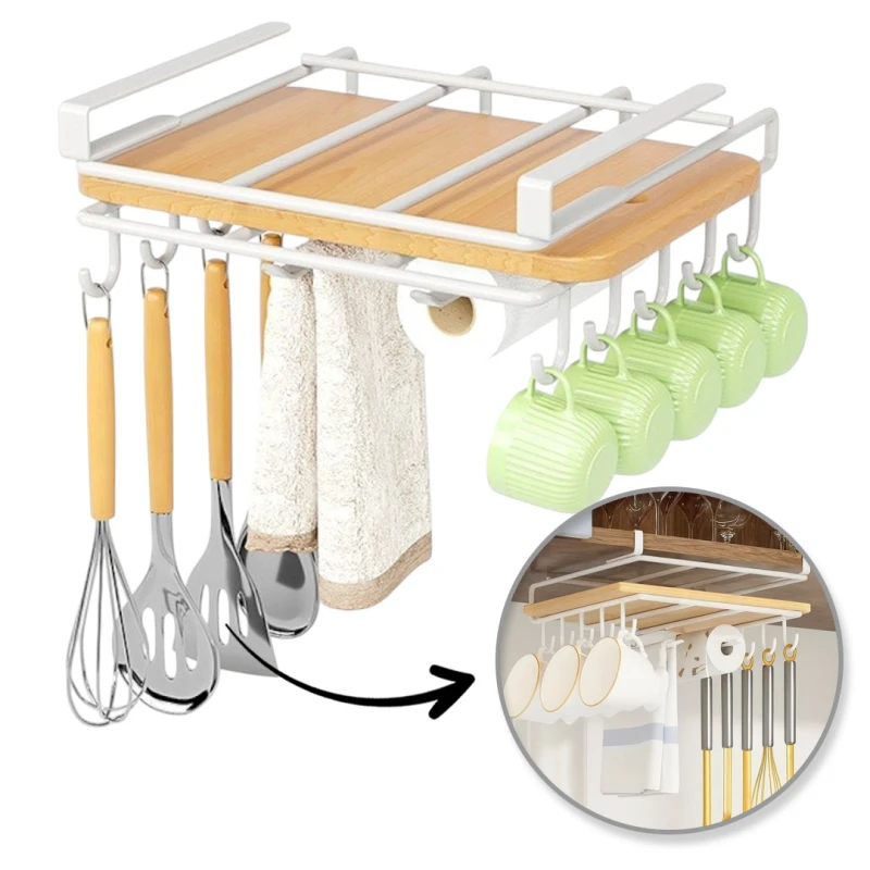 Pakabinama lentynėlė po spintele su kabliukais – tai paprastas būdas išnaudoti tuščią vietą po virtuvės spintele. Ji leidžia patogiai laikyti puodelius, popierinius rankšluosčius, pjaustymo lenteles ar virtuvės įrankius, neapkraunant stalviršio.