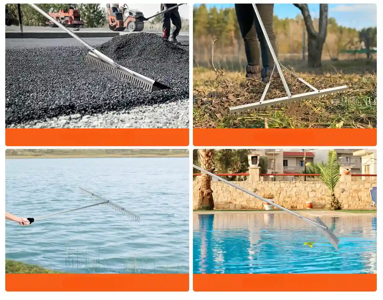 Grėblys pagamintas iš aliuminio lydinio, todėl išlieka lengvesnis, bet pakankamai tvirtas kasdieniams lauko darbams. 37 dantų konstrukcija padeda efektyviai surinkti lapus, žolę, plūduriuojančias sąnašas ir kitas smulkesnes atliekas, o ilgas kotas leidžia patogiau pasiekti tolimesnes vietas ir dirbti mažiau pasilenkus. Greito surinkimo konstrukcija su fiksavimo mechanizmu leidžia grėblį paprastai surinkti, išardyti ir patogiau laikyti po naudojimo.