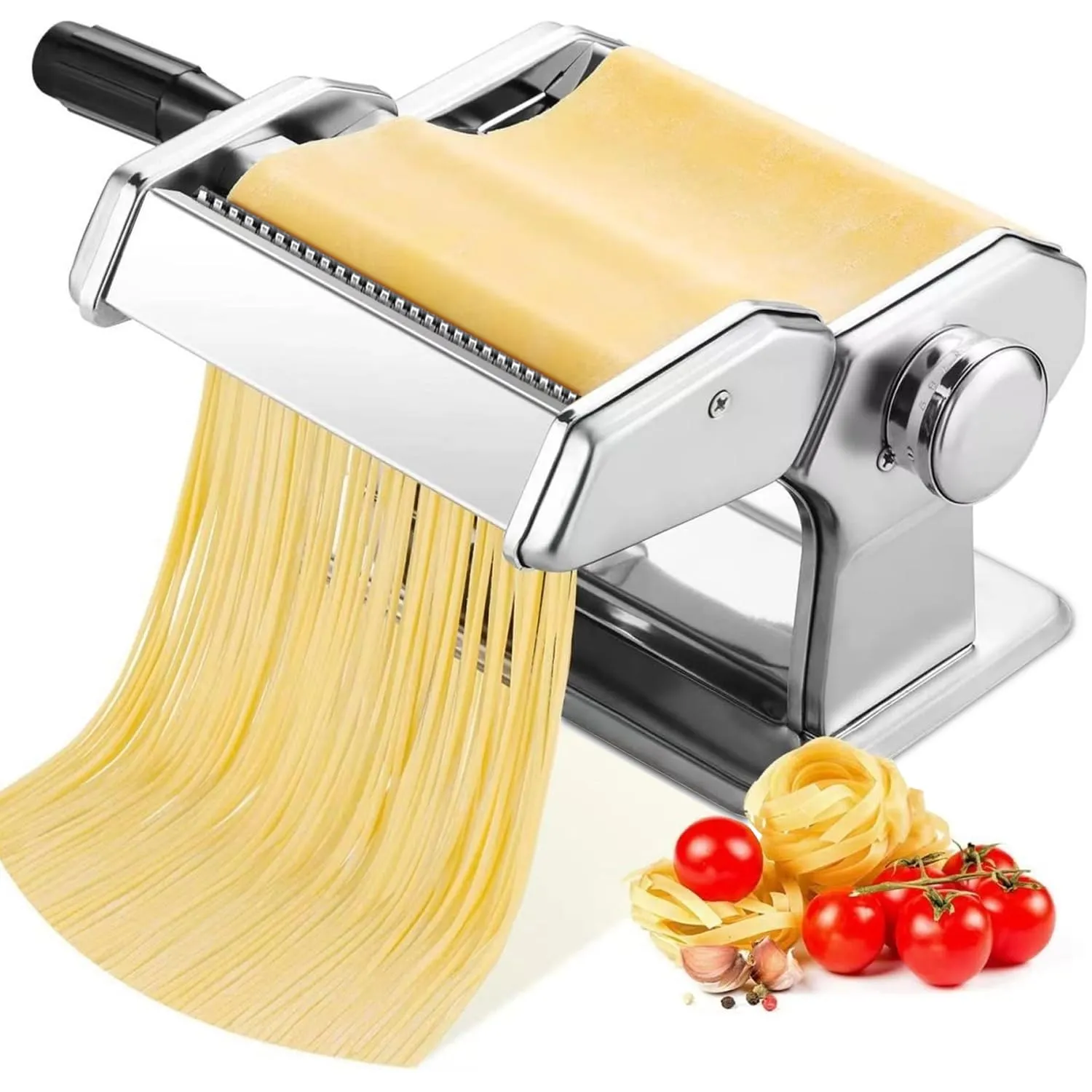 Rankinė makaronų gaminimo mašina leidžia lengvai ir greitai pasigaminti šviežius naminius makaronus savo virtuvėje. Reguliuojamas tešlos storis ir specialūs pjaustymo voleliai suteikia galimybę formuoti skirtingų tipų makaronus – nuo plonų juostelių iki platesnių lakštų.