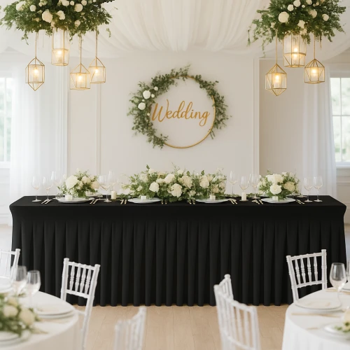 Tamprus užvalkalas banketiniam stalui su klostėmis, juodas, 180×76 cm – praktiškas ir estetiškas sprendimas norint greitai suteikti stalui tvarkingą bei reprezentatyvų vaizdą. Juoda spalva atrodo solidžiai, lengvai dera prie įvairaus dekoro ir puikiai tinka vestuvėms, banketams, konferencijoms, pobūviams, restoranams, viešbučiams ir kitoms progoms, kur svarbi elegantiška aplinka.