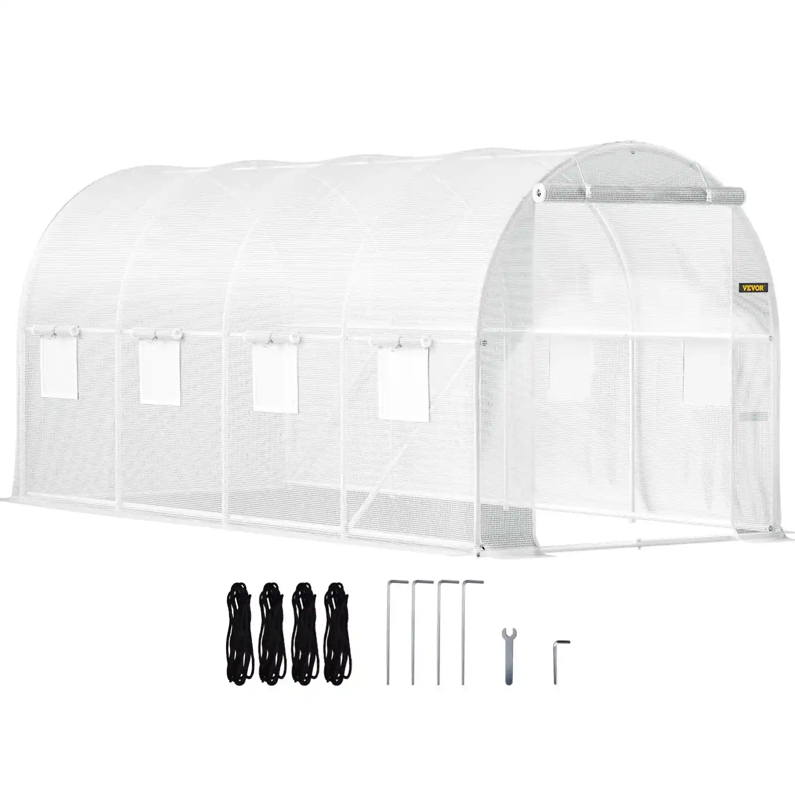 Komplektacija: tunelinis šiltnamis, 2 veržliarakčiai, 4 tvirtinimo kuoliukai, 4 įtempimo virvės, PE danga