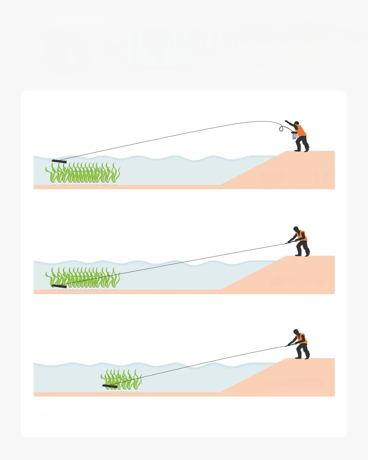 • Dvipusis grėblio dizainas: ilgi kablio formos dantys padeda efektyviau sugriebti vandens augalus ir plūduriuojančias sąnašas.
