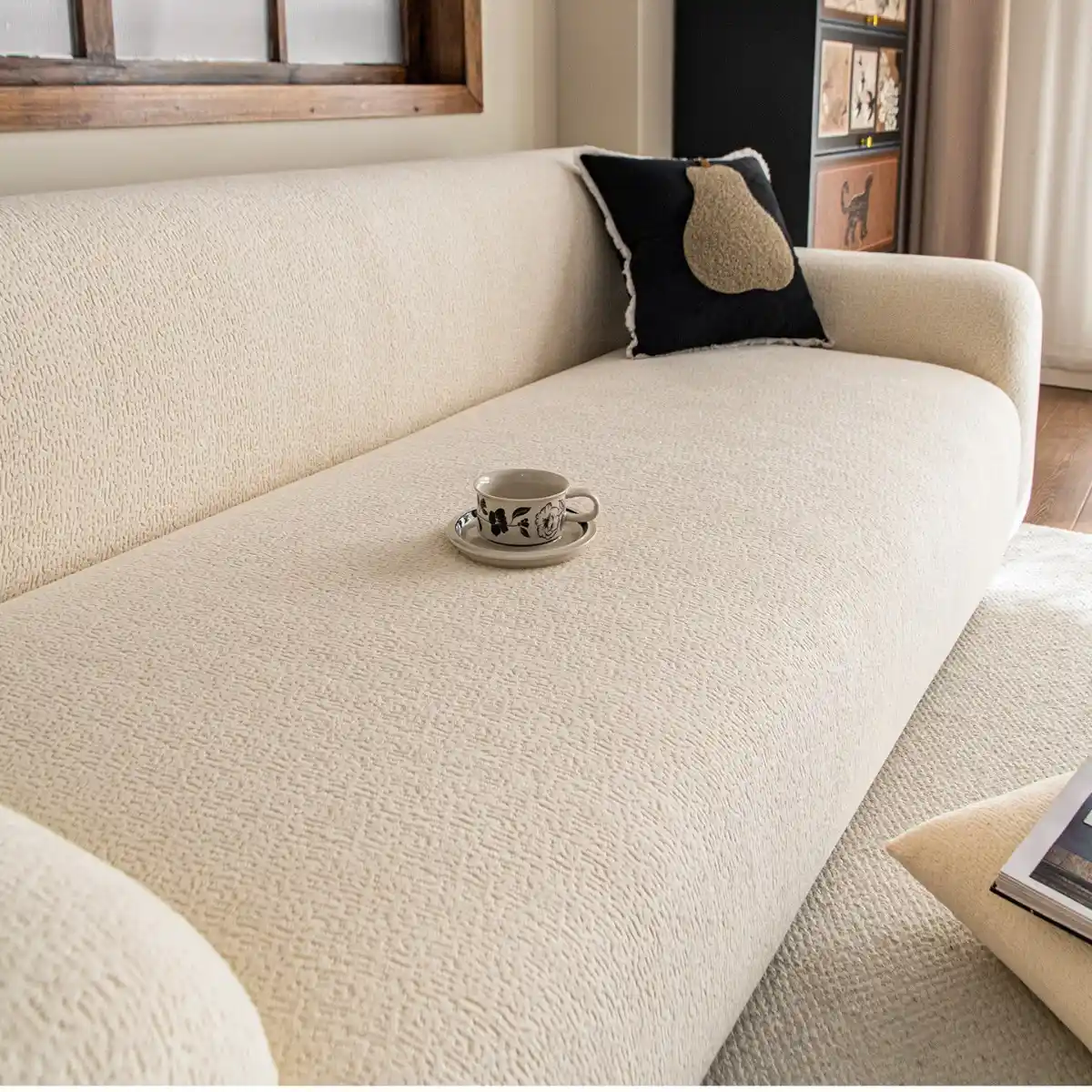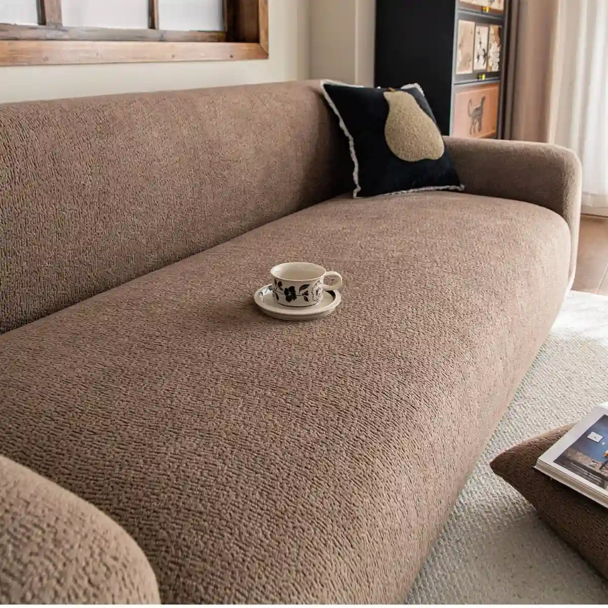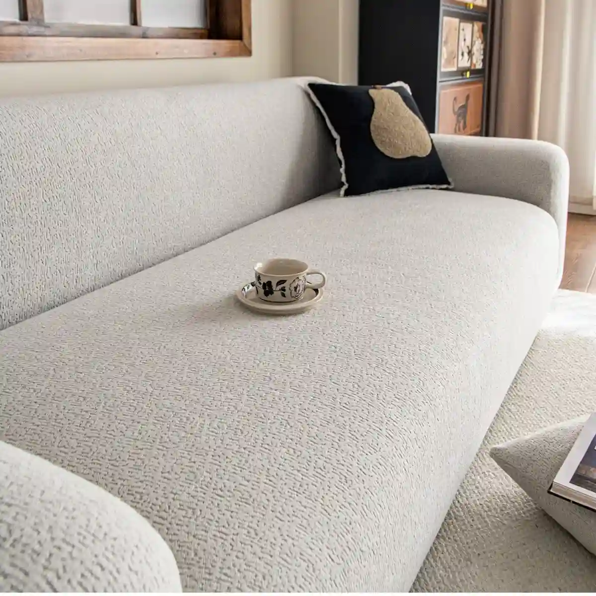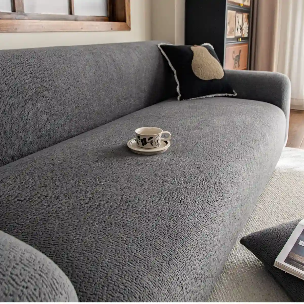 Užvalkalas pagamintas iš lygaus, minkšto ir elastingo audinio, kuris malonus liesti ir gerai išlaiko formą. Medžiaga nėra per stora ar per plona, todėl tinka naudoti visais metų laikais. Elastinga struktūra leidžia užvalkalui lengvai prisitaikyti prie skirtingų sofos formų ir dydžių.