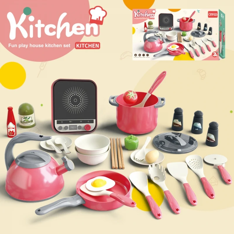 Vaikiškas rožinis virtuvės rinkinys su kaitlente, 30 dalių