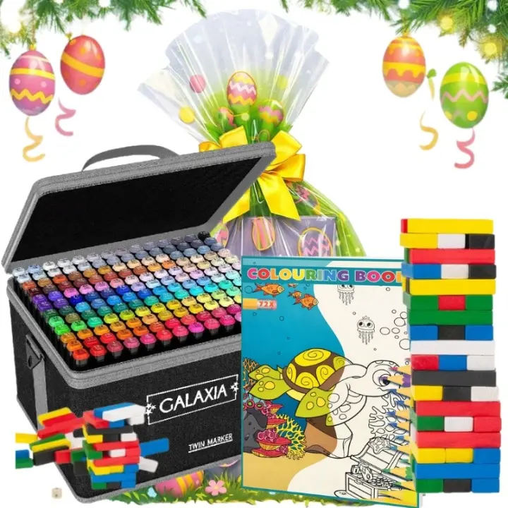 Šis rinkinys leidžia vaikams piešti, spalvinti ir smagiai žaisti su draugais ar šeima. Dvipusiai markeriai suteikia galimybę kurti ryškius piešinius, didelė spalvinimo knyga lavina kūrybiškumą, o medinis bokšto statymo žaidimas suteiks daug smagių akimirkų visai šeimai. Rinkinys nėra iš anksto supakuotas – dovaną supakuosite patys, naudojant pridedamą permatomą celofano maišelį.