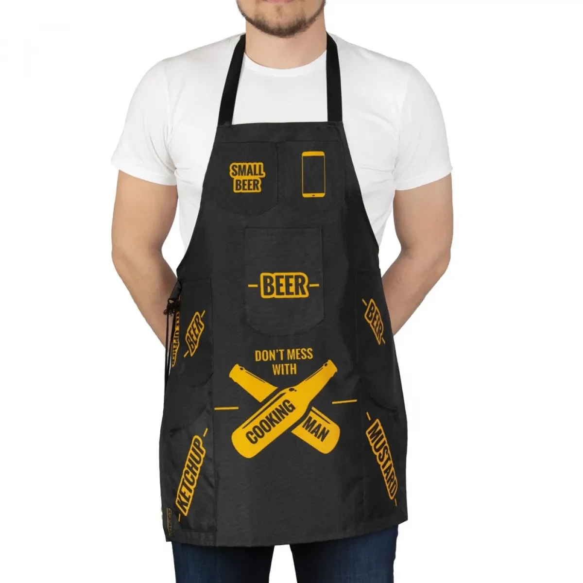 Integruotos kišenės leidžia patogiai laikyti padažus, gėrimą ar telefoną, o prisegtas butelių atidarytuvas reiškia viena – nereikia nieko ieškoti. Tai praktiška dovana vyrui, kuris vertina humorą, funkcionalumą ir gerą laiką virtuvėje ar prie kepsninės.