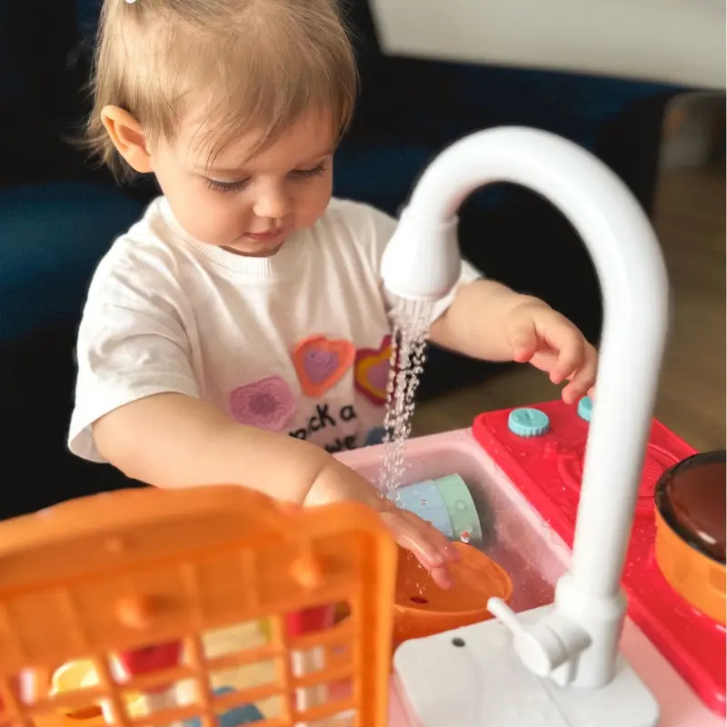Rinkinys turi džiovyklę, vietą indams, pakabukus įrankiams ir maisto produktus, kuriuos galima naudoti žaidžiant maisto ruošimą. Tekantis vanduo padeda sukurti realistišką aplinką ir skatina vaiką savarankiškai tyrinėti kasdienius darbus.